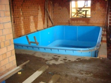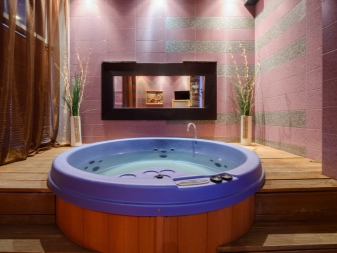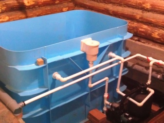 Más rápido y más barato puede ser arreglado baño de la piscina con un recipiente de plástico o polipropileno, que no requiere un trabajo costoso para crear una capa protectora a prueba de agua. Además, este tipo de fuentes se refiere a estructuras plegables, y es conveniente utilizarlas en habitaciones con espacio limitado. Los lavabos de plástico se ensamblan con láminas de polipropileno. Son fáciles de montar y, cuando se necesita espacio, pueden desmontarse fácilmente y transportarse a otra habitación o a la calle.