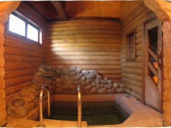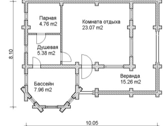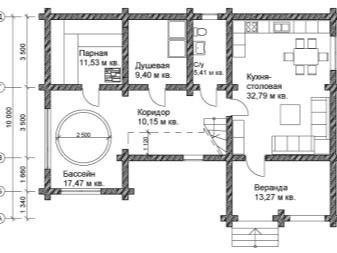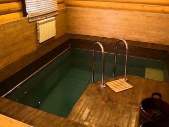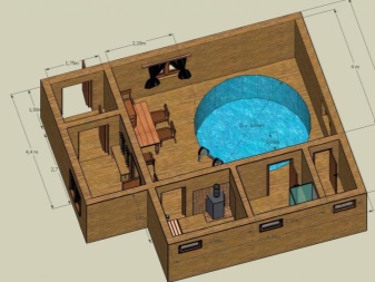 Las casas de baño de una sola planta pueden construirse de forma angular, rectangular o con otras configuraciones de planta. Las piscinas junto a la sala de vapor rusa pueden ser bastante pequeñas, de 2x2 metros. Pueden llenarse con agua a temperatura ambiente o calentarse, según la temporada.