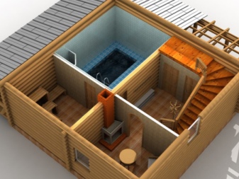 Cuando se elige una residencia privada de dos plantas, la planta baja alberga una piscina de hormigón, una sauna y un vestuario con ducha. En la primera planta, hay un ático con zonas para diversos eventos, para socializar y para relajarse al aire libre. Si es posible, el calentador debe instalarse entre la sauna y el comedor común. Esto garantiza que el calor se distribuya uniformemente por todo el edificio. Las habitaciones del ático se utilizan a menudo como habitaciones de invitados, pero tenga en cuenta que los vapores húmedos subirán desde abajo. Por lo tanto, debe instalarse una barrera de vapor especial en el techo. Puede tratarse de una película o lámina, sobre la que se coloca el aislamiento y encima un suelo limpio. Todas las piezas de madera deben tratarse con un antiséptico y los huecos entre los suelos deben sellarse con espuma de montaje.