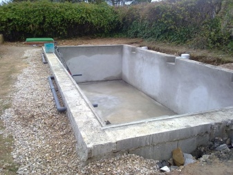 La construcción de la piscina propiamente dicha comienza con la excavación de un agujero teniendo en cuenta la profundidad total, el grosor de los cimientos y la capa de acabado. Si las aguas subterráneas están demasiado cerca, hay que drenarlas mediante un sistema de desagüe. A continuación, se instalan estructuras de drenaje que deben estar por debajo del nivel inferior. A continuación, los trabajos de instalación se realizan vertiendo el hormigón sobre el encofrado, con la armadura preparada. La forma de la pila puede ser cuadrada, rectangular o redonda, con un fondo ovalado. Las piscinas profundas tienen escalones que son una extensión del fondo y se vierten junto con toda la piscina.