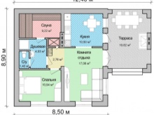 - Kui soovite, saate teha ilusa 8,90 x 12,40 meetri suuruse telliskivist saunamaja. Hoone paigutus hõlmab selliseid olulisi ruume: saun, duširuum koos vannitoa ja magamistoaga ühes pooles ning köök ja avar puhkeruum teises pooles. Majapidamine ei saa selles keskkonnas mitte ainult puhata, vaid ka elada, sest seal on kõik vajalik olemas.