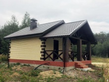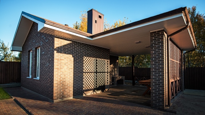 - Kaasaegne, halltellisest telliskivist saun näeb efektne välja. Sissepääsuala peaks olema täiendatud suure kaetud verandaga, kuhu on paigaldatud telliskivist ahi. Siia tuleks paigutada ka puidust lauad ja toolid, mis on suurepärane koht lõõgastumiseks sõbralikus seltskonnas.