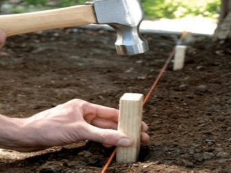 - Märgistage vundamendi ala projekti alusel. Nurkadesse ja piki seinu paigutatakse vaiad. Pingutage nööri nende vahele.
