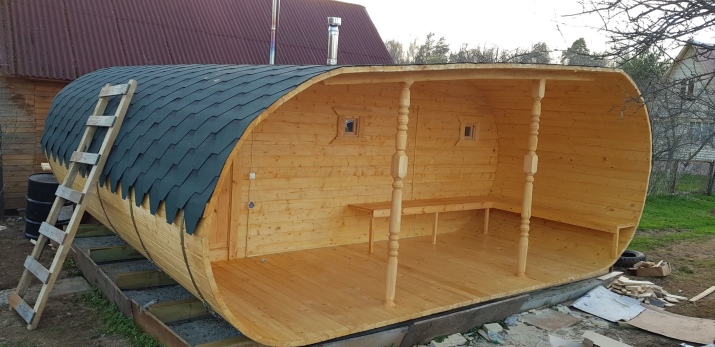 Kõige sagedamini kasutatakse raamvannitünnid. Nad ei nõua sihtasutuse loomist. Alumine tasapind on moodustatud vähemalt 0,5 cm paksustest kõvaservalistest laudadest. Ristpuud on kokku pandud 1,5 m vahega. Tehke neile ümarad sisselõiked, et need sobiksid sauna kontuuridega; selleks on vaja tugevaid šabloone. Osade ühendamiseks aitavad kruvid ja kokku pandud "tünni" tugevdamiseks osta terasest nurgad, kinnitades need nurkadesse ja liigestesse.