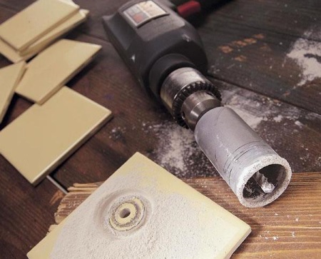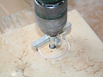 Kui teil on vaja teha plaati läbiv auk, võite kasutada ka spetsiaalset puurimispuuri, mida nimetatakse "baleriinaks". See meenutab tavalist kompassi ja toimib samal põhimõttel. Augu tegemiseks eemaldage esmalt plaadi esiküljelt vasara ja tikkuriga glasuur, puurige auk ja seejärel seadistage käsitsi vajalik läbimõõt lõigatava elemendi keskelt kuni selle lõikeservani. Puurige ainult madalate pöörete juures, sest liiga kõrged pöörded tekitavad lõikeservale minilipikuid.