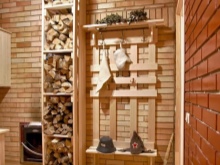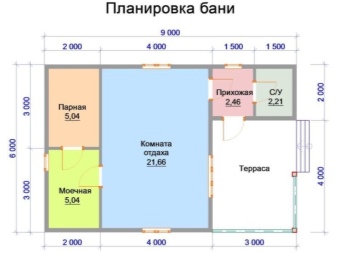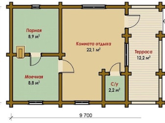 On toinenkin mielenkiintoinen vaihtoehto - terassilla. Sisätilat pysyvät samankokoisina, ja eteinen on jaettu kahteen osaan, joista toista osaa käytetään terassina. Ja se on loistava vaihtoehto. Kesällä voit rentoutua viihtyisällä terassilla ja hengittää ilmaa saunan jälkeen. Näin rentoutumishuoneeseen pääsee sekä eteisestä että terassilta.