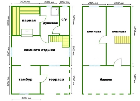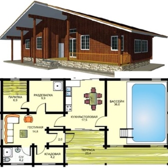 Tämä ei tietenkään ole ainoa ulkoasuvaihtoehto. Jos esimerkiksi teet suihkusta ja höyrysaunasta tiiviimmän, sinulla on mahdollisuus tehdä uima-allasJa jos valitset ensimmäisen kerroksen, yläkerrassa on oleskelutiloja koko perheelle: makuuhuone ja jopa ruokasali. Ullakko - ei ole huono vaihtoehto, se säästää tilaa ja voit varustaa virkistyshuoneen, kun taas sen alla voit suunnitella tilaa kaikkien tarpeiden mukaan: esimerkiksi tehdä tilava höyrysauna, mukava suihku, jopa pieni hierontahuone.