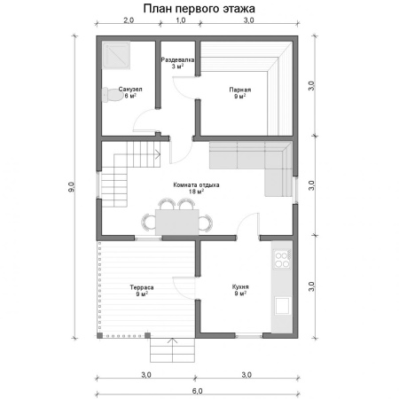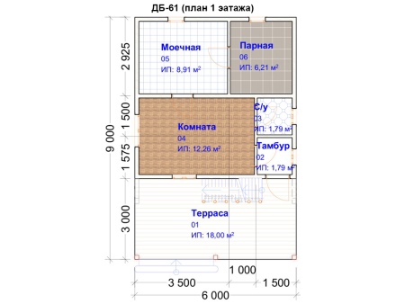 Suihkuhuoneesta johtaa ovi höyrysaunaan.. Tällä pohjaratkaisulla mitat ovat suunnilleen seuraavat: 6x3 metrin eteinen ja saman verran oleskelutilaa. Muiden huoneiden osalta suihkuhuoneen ja wc:n pinta-ala voi olla 3x3 m, ja sama määrä tarvitaan höyrysaunaan.