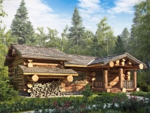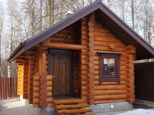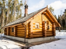 - A kompakt fürdő eredeti kialakítása. A kompakt épület úgy néz ki, mint egy klasszikus orosz kunyhó az erdő szélén. Az építők régi, vastag rönköket használtak.