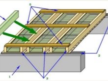 Így alakul ki a nyers födém. A szabványos beépítési utasítások tartalmazzák a párazáró és hőszigetelő réteggel való borítást. Ezután következik a nedves szigetelés és a padló alatti padlózat. Ezután a fóliát is leszögezzük, és a léceket a gerendák tetejére fektetjük. Néha lehetséges, hogy a fehér padlót egyszerre a tető alá fektessék ezzel a módszerrel, anélkül, hogy korlátoznák magukat a fesztáv hosszában, a hőszigetelés bármilyen terhelését viselve, de vannak gyengeségei: