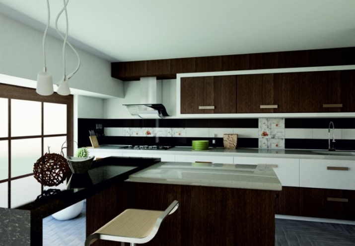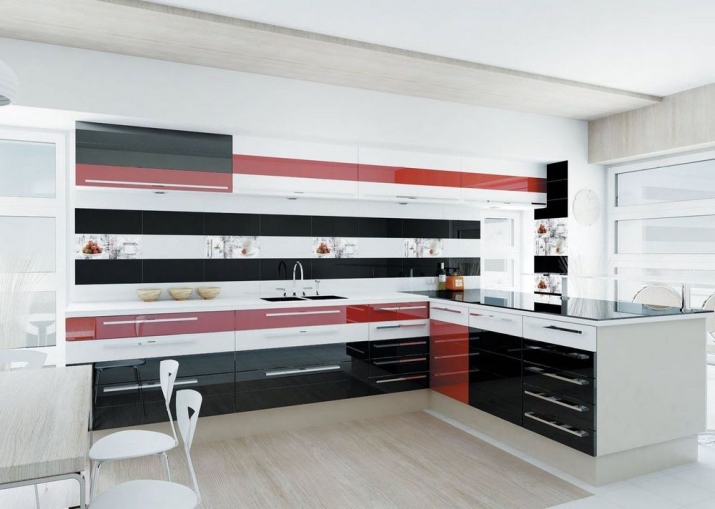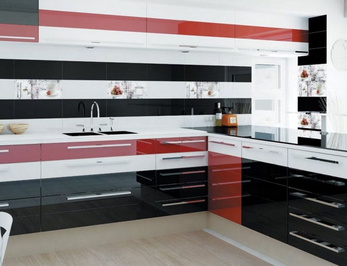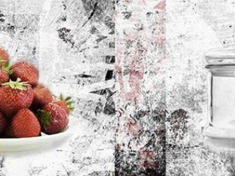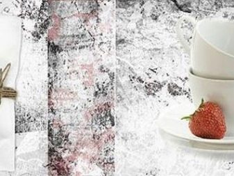Az anyag kiváló megoldás a konyhában. Öröm lesz ilyen környezetben vacsorázni. A monokróm elemek kiegészíthetők bogyósgyümölcsös részletekkel, amelyek eredetinek és "étvágygerjesztőnek" tűnnek.