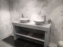 - Könnyű használat. A márványlapok, ha megfelelően fűrészeltek, nem morzsolódnak, törnek vagy változtatják meg szerkezetüket. Teljesen összhangban van az Ön által választott formával. Távolságtartás nélkül, egyetlen darabból is lefektethető. Ez megakadályozza, hogy a szennyeződés, a vízkő és a baktériumok felhalmozódjanak az illesztéseknél.