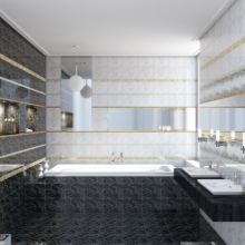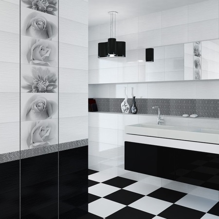 Kerámia csempe kifinomult kialakítással. Ez a kollekció a hátterek játékát mutatja be: fehér és fekete. Az alap kerámia készlet gyönyörűen dombornyomott hullámos mintával rendelkezik.