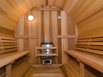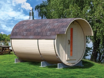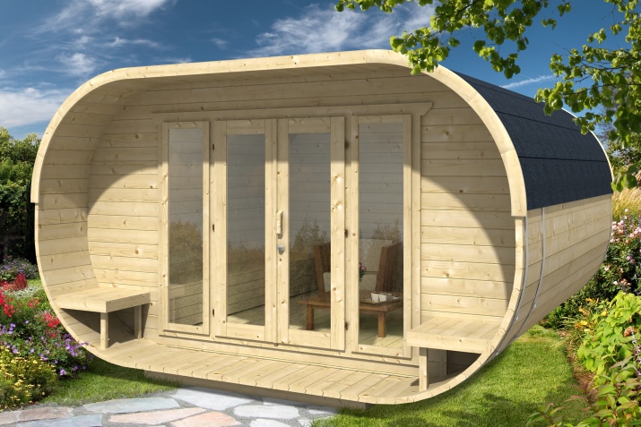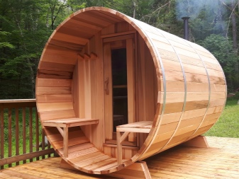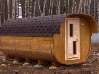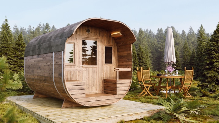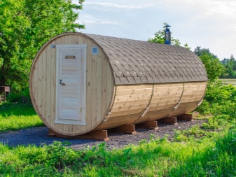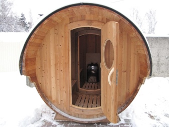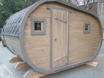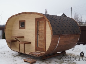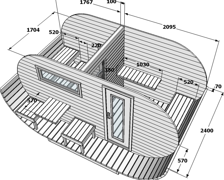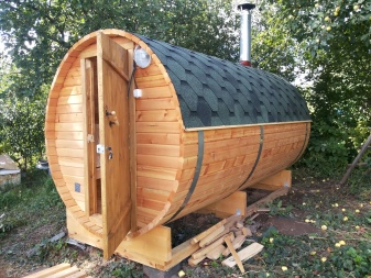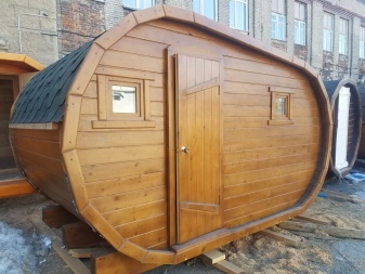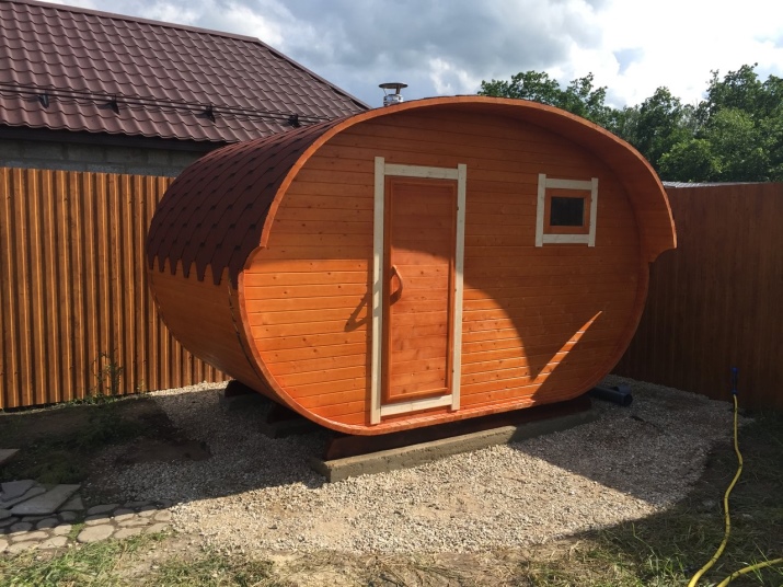 Il bagno a botte di forma ovale ha un aspetto insolito, ma nella sua costruzione differisce poco dalle sue controparti a telaio di legno. Si tratta di una struttura tradizionale a telaio, rivestita di legno e serrata con cerchi di metallo, simile ai prodotti della bottaia. La forma ellissoidale gli conferisce alcuni vantaggi. È facile riscaldare l'interno - in estate ci vogliono 15-20 minuti, in inverno fino a 1 ora. Per l'accensione e il mantenimento del calore utilizza meno legna, inoltre, nell'uso stagionale è possibile installare anche un fornello elettrico con una stufa da sauna all'interno.
