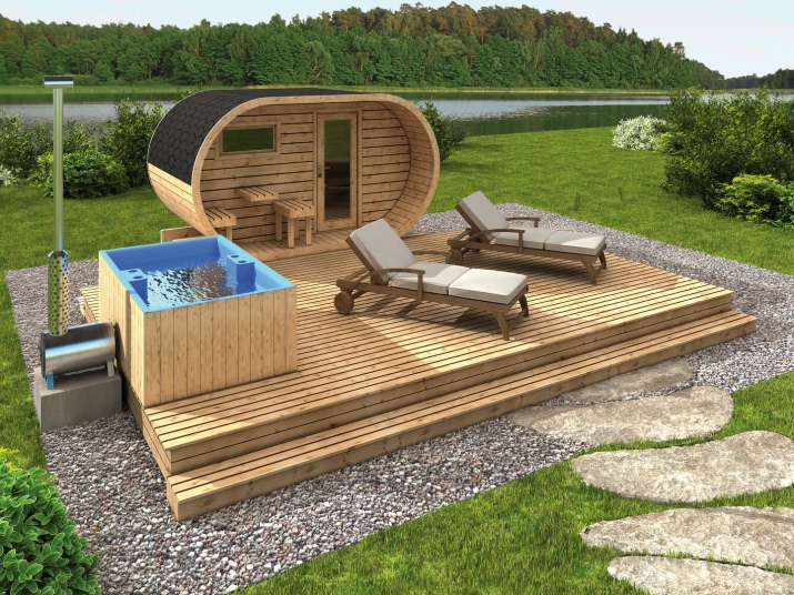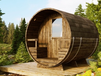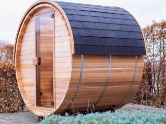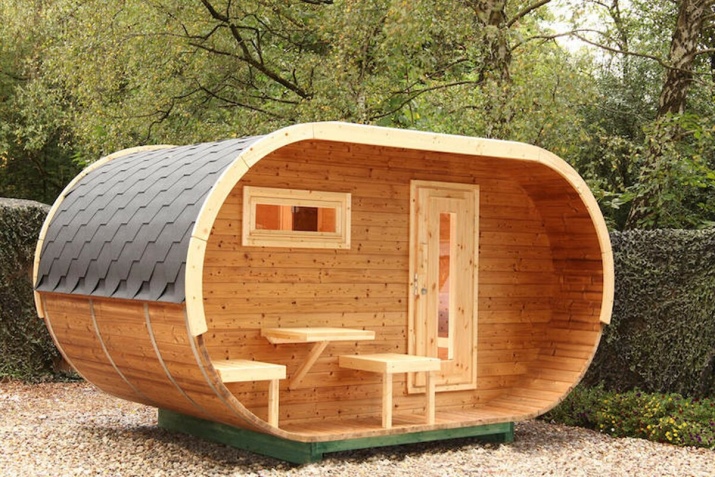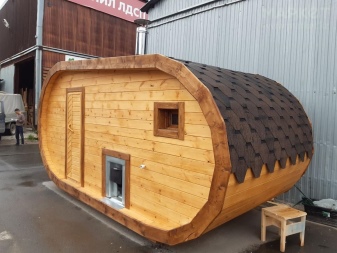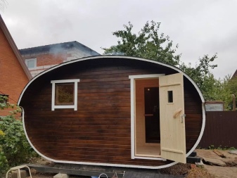 La forma arrotondata del mini-bagno è la scelta di molti vacanzieri. Casetta di legno a forma di botte, serrata con morsetti. L'aria riscaldata circola per convezione, dato che non ci sono angoli nella stanza. Grazie alla forma del progetto, la sauna è ben ventilata, il che evita la muffa e l'umidità.
