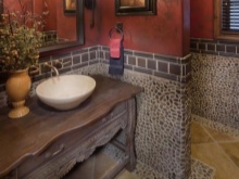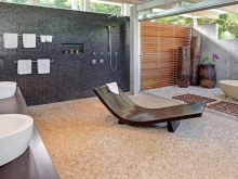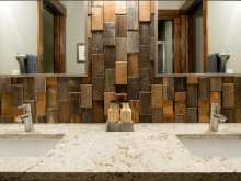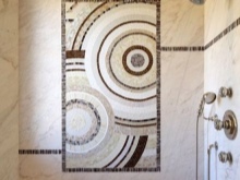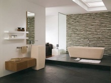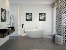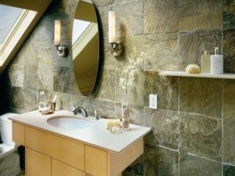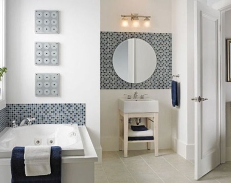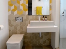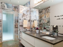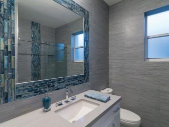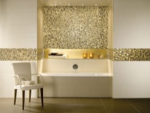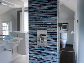 Un'altra opzione sarebbe quella di accentuare l'immagine con un mosaico. L'area intorno allo specchio, la vasca da bagno, i pensili, gli apparecchi di illuminazione ecc. possono essere decorati con mosaici. Il mosaico può essere abbinato al tono del pavimento di base o può essere contrastante. I mosaici possono essere di forma quadrata regolare di diverse dimensioni o assumere la forma di forme geometriche più complesse (ovale, cerchio, goccia, ecc.).