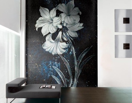 Un enorme pannello piastrellato aiuta a diversificare il sobrio interno in bianco e nero. Ideale per una decorazione insolita.