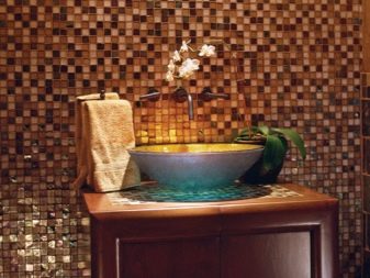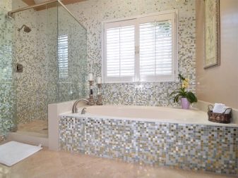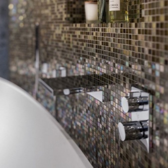 Le piastrelle che imitano un mosaico sono altamente resistenti all'acqua. Ecco perché è spesso usato in stanze con alta umidità, tra cui piscine, saune o bagni. La bellezza estetica della muratura a mosaico è impossibile da descrivere a parole: la superficie luccicante e scintillante è come scolpita da tanti piccoli cristalli.