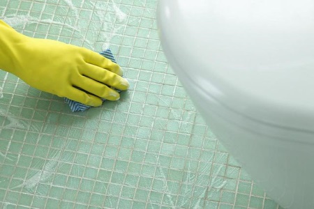 - Trattare i giunti del mosaico con un prodotto speciale per prevenire la muffa. Dopo il trattamento, il prodotto in eccesso deve essere rimosso e le cuciture pulite con un panno pulito.