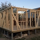 - 次に、フレームの壁を組み立てる必要があります。この段階では、縦方向と横方向の部品を次々に追加していきます。そこにOSBシートやバテンなどのクラッド(下地材)を貼り付けていく。窓やドアの開口部はすべて、あらかじめフレーム構造に考慮されている必要があります。