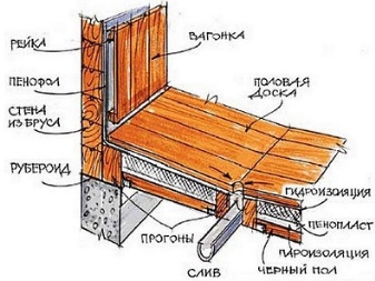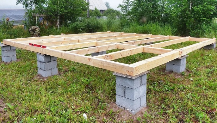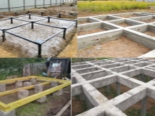 - まず、下部構造のボトムストラッピングを設置します。防腐剤で丁寧に処理した梁や板を使うことができます。その上に将来の床材用の梁を固定する。全体的に防湿剤とマスチックで防水をする。