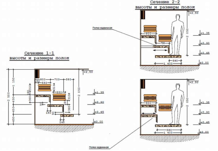 今はサウナを作る前に、図面が必要なんです。外観はもっとシンプルです。一方、インテリアは、仕上げや家具の配置などのプランが必要です。 お風呂を構成する要素の配置を別々の図面にする人もいますが、これは一つのスケッチにくしゃくしゃにしたスケッチを入れるよりずっと便利です. 以下は、スチームルームの大まかなレイアウトで、棚の寸法やクッカーの立ち位置などを示したものです。