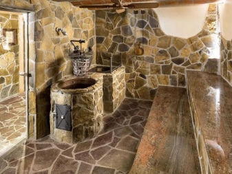 また、スチームルームに天然石をあしらったケースもあります。 皆さんが思い描く巨大なスラブというイメージは、決して正しいものではありません。国産・輸入を問わず、さまざまなメーカーから供給される小型のタイルを使えば、同じ結果を簡単に得ることができるのです。レンガ、普通コンクリート、気泡コンクリートなどをベースに使用することができます。木や石膏ボードの上にタイルを敷くのは、支持補強がある場合のみです。