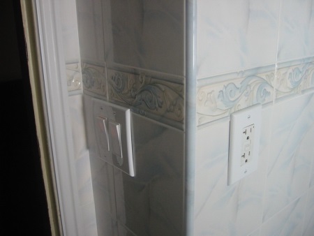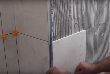 Sutvirtinę išorinį kampą, galite pradėti plytelių klijavimą ant sienų. Jei viena siena jau išklijuota plytelėmis, išorinis išorinio kampo kraštas turi būti vienoje plokštumoje su plytele, priešingu atveju gaminį reikia montuoti su nedidele iškyša, lygia plytelės pločiui. Plyteles pradėkite kloti nuo profilio, kurio perforuotas pagrindas yra po pirmąja vertikalia plytelių eile. Priklausomai nuo montavimo būdo, plytelės turi būti iš anksto apipjautos ir svarbu nepamiršti, kad kai kurios jų bus profilio griovelyje. Plyteles reikia kloti labai atsargiai, kad nejudėtų išorinis kampas, nes kitaip visa apdaila "plūduriuos".