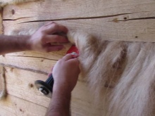 Pirms darba uzsākšanas vispirms atstājiet sūnas nožūt svaigā gaisā un regulāri tās apgrieziet. Pēc tam materiāls tiek mērcēts 30-60 minūtes, izspiests un pēc tam izklāts slānī un izlīdzināts tā, lai gali abos guļbūves galos karājas uz leju. Kad visi baļķi ir sakrauti, liekās šķiedras ir jāsaīsina vai jāaptin un jāievelk atpakaļ spraugās. Turpmākie darba posmi notiks tikai pēc 6 mēnešiem un 1,5 gadiem, un viss process būs trīs posmu process.