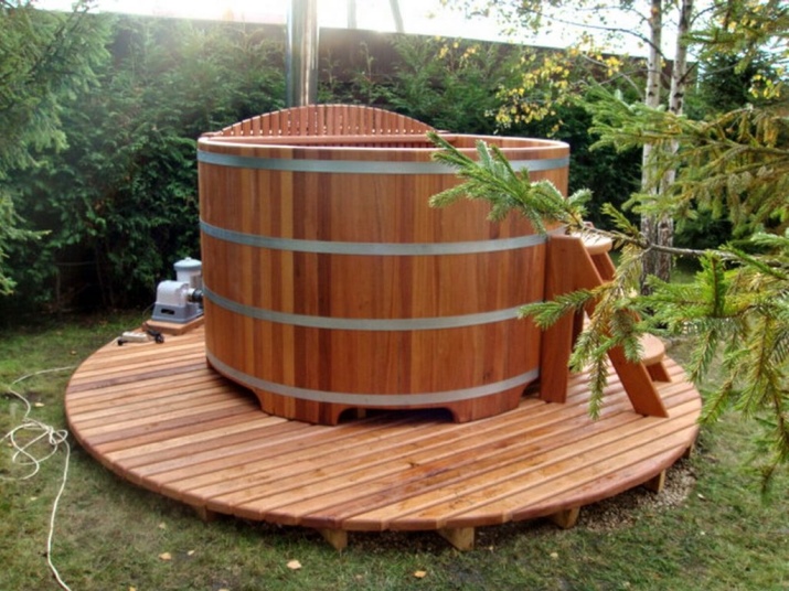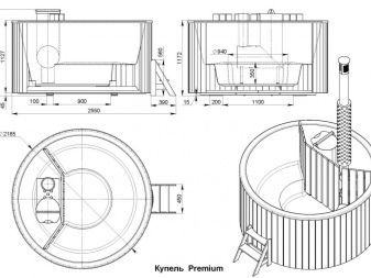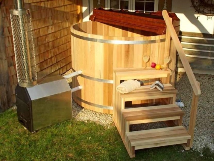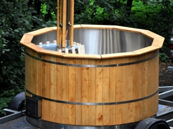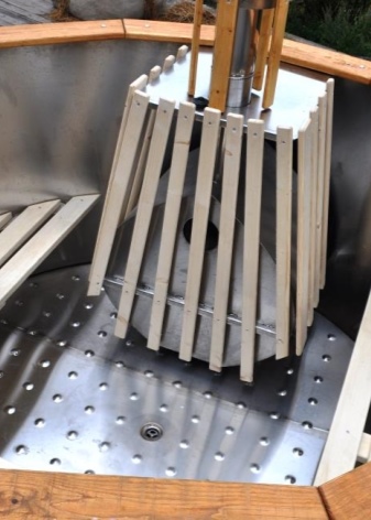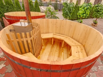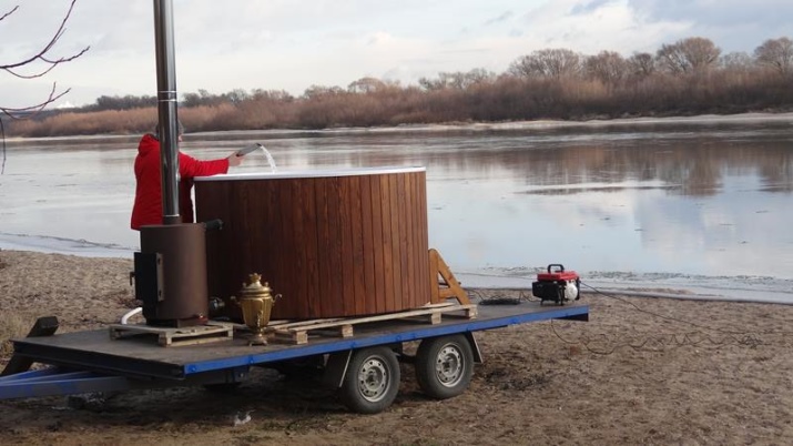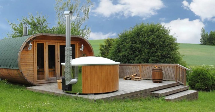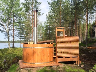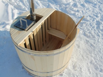 Deze manier om een plaats voor ontspanning te creëren is origineel. Het is namelijk gebaseerd op een gewone houten kom. Ongebruikelijk is het ontwerp. Naast het verwarmingselement bevindt zich een ruimte voor het hakken van hout, die een speciaal vleugje romantiek toevoegt. De saunakachel is gemaakt van een traditionele metalen oven. Op dezelfde manier als bij de vorige methode kan ook de ruimte voor een tabel worden gecreëerd.