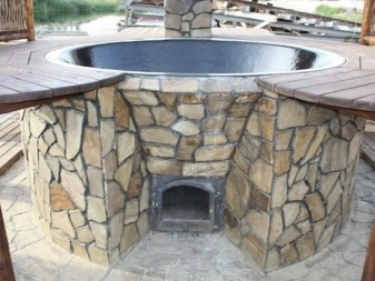 Een andere oplossing is een gietijzeren bak als basis te gebruiken en deze te omlijsten met gevoerde stenen. U kunt hier uw fantasie de vrije loop laten, u kunt er bijvoorbeeld een tafel voor fruit en alcoholische dranken naast maken met een stenen voet, en de treden mooi laten uitzetten. Het enige waar u aan moet denken is hoe u niet alleen de doopvont, maar ook de hele constructie verwarmt.