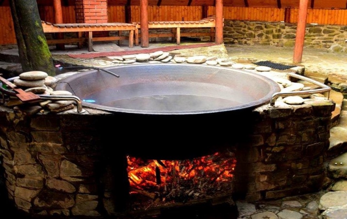 Voor een stalen kom worden de stalen palen van tevoren klaargemaakt. De structuur wordt door middel van kettingen aan deze steunen opgehangen. Dit soort bouwwerkzaamheden kunt u waarschijnlijk niet zelf uitvoeren. Op zijn minst zult u de hulp van een paar mensen meer nodig hebben om de structuur op te tillen. Het is ook de moeite waard te overwegen hoe het verwarmingssysteem zal functioneren.