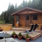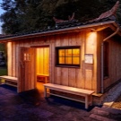 Een luxueus badhuis, opgetrokken uit boomstammen, met een al even luxueuze Japanse furako. Het gebouw doet denken aan een sprookjesachtig herenhuis, met houten vloeren die van het badhuis naar de met stenen geplaveide binnenplaats leiden en houten bordestrappen, die een verbluffend gevoel van comfort geven aan blote voeten.