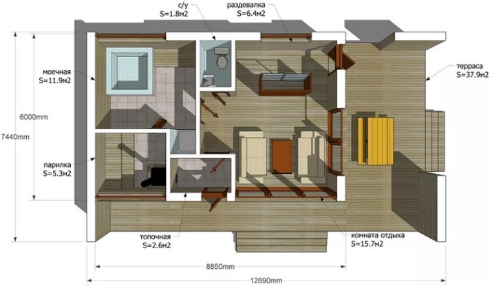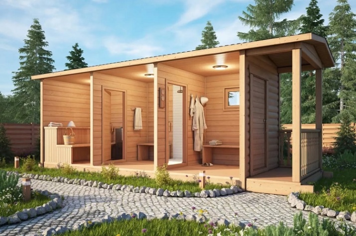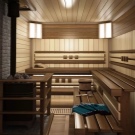 U kunt een sauna inrichten zoals u wilt, maar de speelruimte wordt beperkt door de grootte en de verplichte ruimtes. Maar zelfs als de totale oppervlakte beperkt is, kan het gebouw een veranda of terras hebben, met een ontspanningsruimte, een doopvont, een buitenzwembad voor gebruik in de zomer.