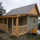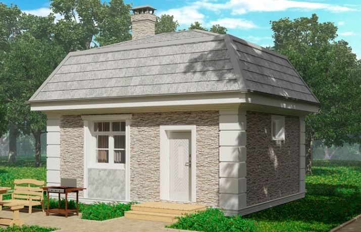 - Het dak. De constructie moet betrouwbaar zijn, met gebruikmaking van waterdichting, thermische isolatie en kwaliteitsdakbedekking. Het type dakbedekking hangt grotendeels af van de locatie en de technische parameters van het gebouw. Op een plaats op het platteland, omringd door bomen, kan een hoog zadeldak worden opgetrokken. In gebieden waar het permanent hard waait, kan bijvoorbeeld als minimale dakhelling een trapdakhelling worden gekozen. Voor een klein badhuis, met een lage sneeuwbelasting, is een dak met één dakhelling aanvaardbaar.