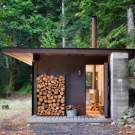De dikke boomstammen houden de warmte lang vast en de geringe afmetingen van de structuur zorgen voor een snelle opwarming. Het dak is bedekt met larikshout, dat perfect past bij het natuurlijke concept van het gebouw.