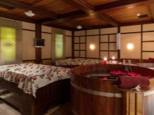 De veelzijdige vloer zorgt voor een therapeutische massage, want het is niet zonder reden dat het Aziatische volk steenmassage op prijs heeft gesteld, en de genezende kracht van het edele hout is bij ons volk al sinds de oudheid bekend. Een Japanse ton kan op elk moment van het jaar worden gebruikt, omdat hij zijn eigen oven heeft. In het saunacomplex is de ontspanningsruimte voorzien van moderne technologie en meubilair.