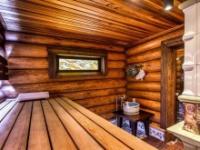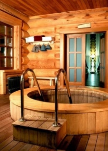 Een prachtig badend ensemble in een landhuis. Het kost veel geld om te bouwen, maar als de eigenaar het zich kan veroorloven, heeft hij een wellness-complex in het klein tot zijn beschikking. De muren zijn gemaakt van natuurlijk hout, de stoomcabine is gemaakt van lindebomen met helende eigenschappen. In de wasruimte zijn de muren van de douche en het zwembad betegeld met gepolijste steen.