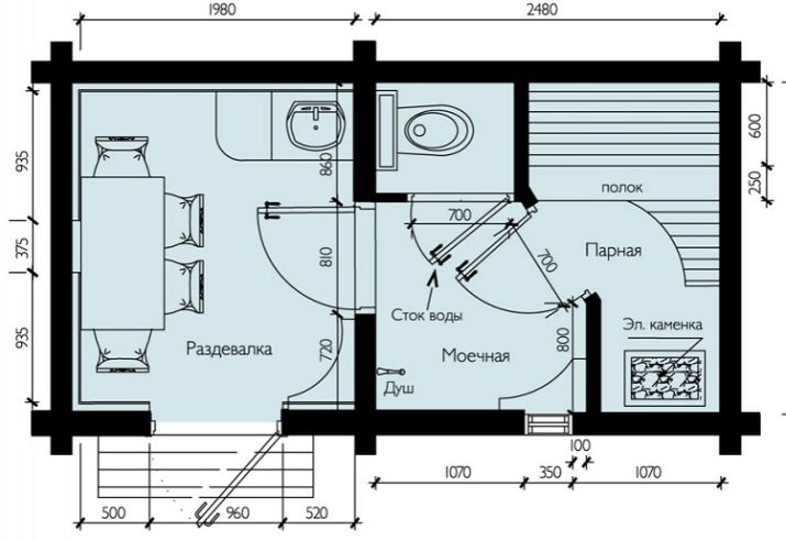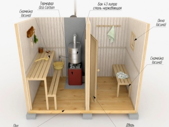 De indeling van de ruimtes in een sauna kan creatief zijn en soms bijna zonder opties, zoals in het geval van de bouw van een minibad. Sommige mensen beginnen met het plannen van de binnenruimte na de bouw van het bouwwerk, maar het is toch beter om dit proces ruim van tevoren uit te voeren, voordat de bouw begint. Deze aanpak zal het gehele complex, ook al is het minimaal, harmonieus maken, met een zo groot mogelijke gezelligheid. Bovendien moet tijdens de bouw rekening worden gehouden met een aantal details, die van essentieel belang zijn om zich later comfortabel te voelen.