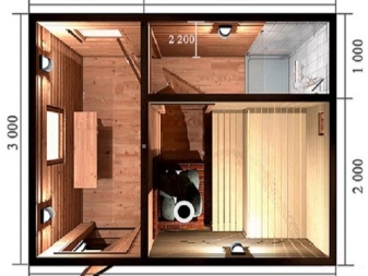 - Drie-bij-drie-meter sauna - een ruimere optie, hoewel het nog steeds klein is. De grootte laat echter wel een beetje planning toe. U kunt bijvoorbeeld de was- en stoomcabines combineren en er een comfortabele ontspanningsruimte van maken. Een andere optie is om een deel van de vestibule om te bouwen tot een doucheruimte.