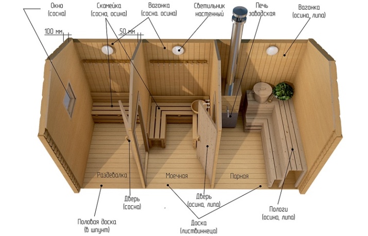 Elke sauna, ongeacht het type, heeft een aantal verplichte ruimtes, zelfs de kleinste.