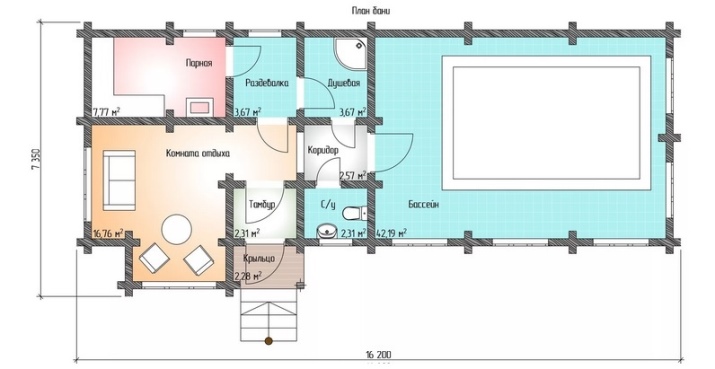 - Het belangrijkste werk wordt gedaan bij het plannen van de binnenruimte - een goed doordachte indeling van de kamers zal helpen om het bad comfortabel en functioneel te maken. Als de ruimte het toelaat, zal de ontspanningsruimte de grootste ruimte hebben. Een tafel, stoelen, een bank en goede verlichting zijn ideaal om samen te komen met een groep vrienden of familieleden uit te nodigen. In een beperkte ruimte, moet je de voorkamer, de kleedkamer en de oven combineren.