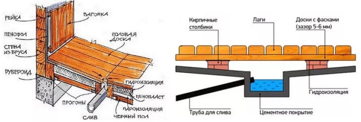 - Vloer. In geval van frame techniek, breng isolatie aan en leg een vloerplaat. In andere gevallen is de installatie van de vloer gecompliceerder. Je moet balken en een ondervloer plaatsen. Daarna worden waterdichting, thermische isolatie en vervolgens beplanking aangebracht. In landhuizen, waar geen tijd is om de sauna grondig te drogen, verdient een betonnen vloer gevolgd door betegeling de voorkeur. Om het comfortabel te maken, moeten er houten latten op worden gelegd.