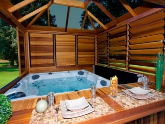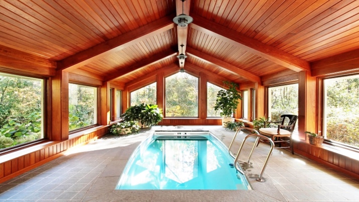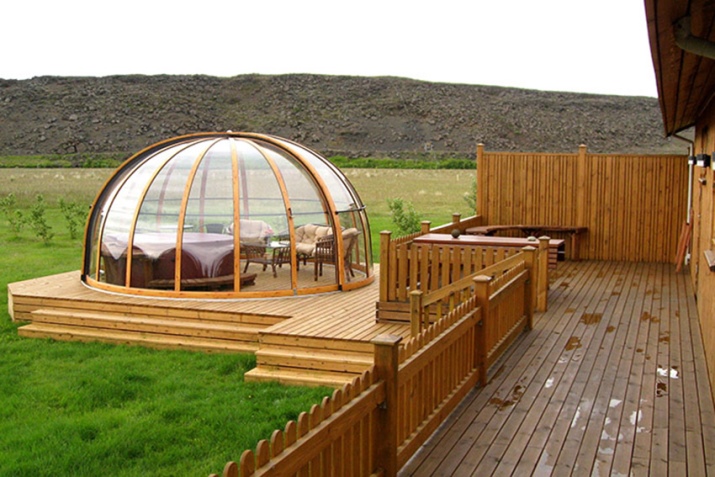 Veranda's kunnen buiten het bad worden gebouwd en hebben een klein zwembad met een zithoek. De structuur wordt overdekt door een rond glazen dak in de vorm van een koepel. De halve bol biedt een goede bescherming van buitenaf en biedt een volledig zicht op de omgeving. De aanbouw met het zwembad is toegankelijk via een terras. Dit ontwerp is ideaal voor een schilderachtige locatie.