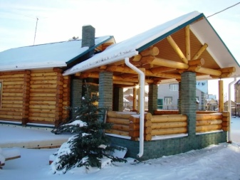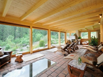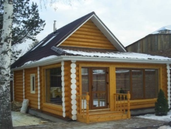 Uitbreidingen zijn er in zomer en winter, met geïsoleerde muren en zelfs een verwarmingssysteem - het hangt allemaal af van het badhuis zelf. Als het wordt gebruikt in het koude seizoen, is het beter om de muren, de vloer en het dak te isoleren, dan vervangt de veranda de rustruimte, de eetkamer, en in de vergrote versie - zelfs een keuken met een fornuis en een barbecueplaats. Soms lijkt het massieve uiterlijk van de aanbouw op een woonkamer met panoramische ramen.