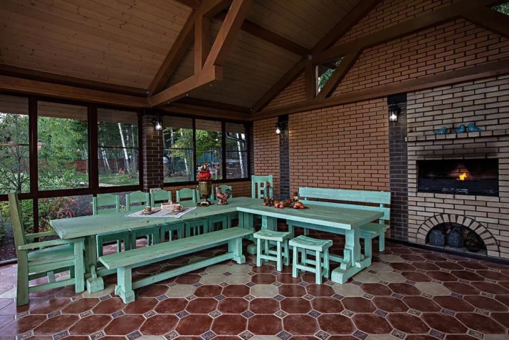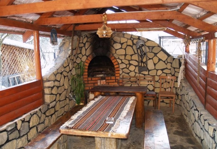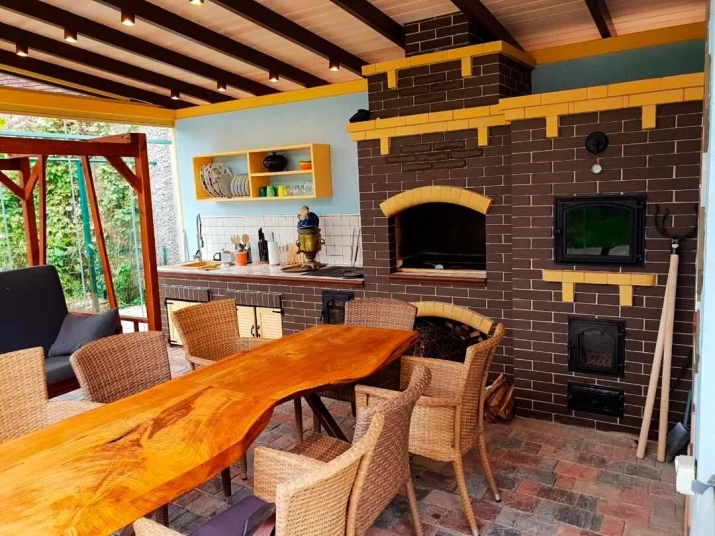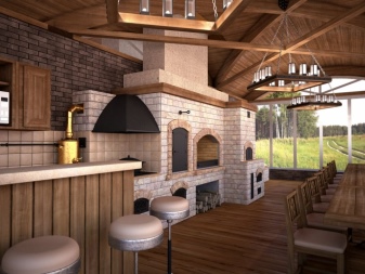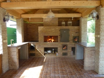 In grote sauna-ontwerpen is er geen dergelijk verband. Open-air keuken veranda's zijn volledig zelfvoorzienend. Vaak hebben ze een oven in de vorm van een modulair complex met een barbecue, een vuurkorf, een tandoor en een rokerij. Een gesloten veranda met een multifunctioneel fornuis moet voorzien zijn van een goed ontworpen afzuig- en brandbeveiligingssysteem.