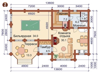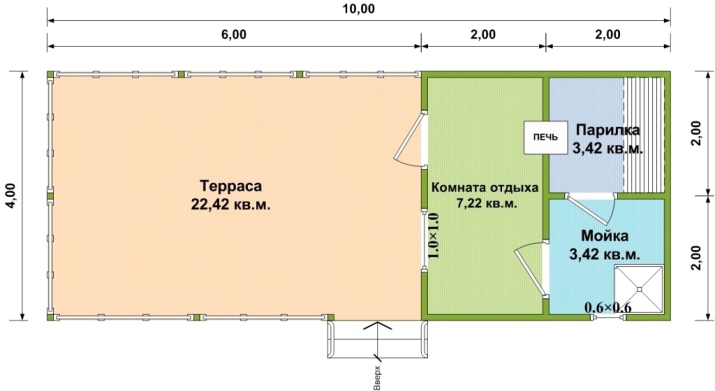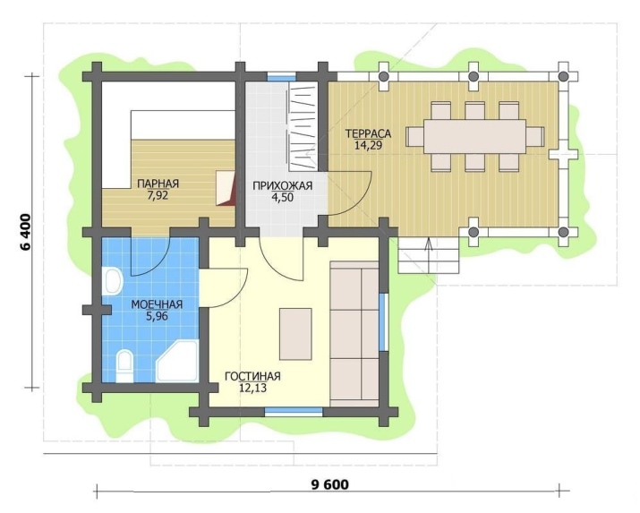 Als u niet veel ruimte hebt en een veranda wilt, kunt u deze kleine ruimte gemakkelijk overbruggen door de eerste verdieping twee keer zo groot te maken. Op de benedenverdieping bevinden zich het stoombad, de doucheruimte en de kleedkamer en op de eerste verdieping de ontspanningsruimte.