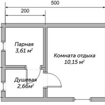 - Middelgroot saunaproject (5,7x5m²) met een ontspanningsruimte, maar zonder voorkamer. In dat geval is het beter om de veranda te isoleren, zodat er geen warmteverlies vanuit de hoofdkamer optreedt. Maar als de sauna alleen in de zomer wordt gebruikt en de toegang tot de stoomcabine via de doucheruimte en de ontspanningsruimte loopt, kan de veranda open worden gelaten.