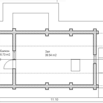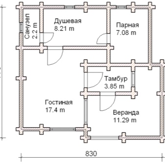 - Een vrij grote sauna van 7,7 x 8,3 vierkante meter. heeft een zitkamer, doucheruimte, WC en vestibule. De saunaruimte bevindt zich in de verste hoek van het gebouw. Het heeft geen zin om de veranda te isoleren met dit soort apparatuur. Een bijgebouw van 11,3 vierkante meter. De L-vorm van de sauna is geschikt voor gebruik in de zomer.