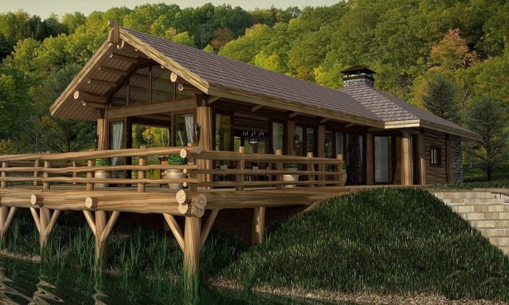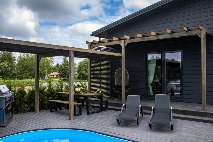 - Een sauna met veranda en terras in een schilderachtige omgeving is uitgerust met een barbecuekooktoestel en een buitenzitje. Ondanks de asymmetrie van de gebroken muur en daklijn, ziet het hele complex er prachtig en harmonieus uit.